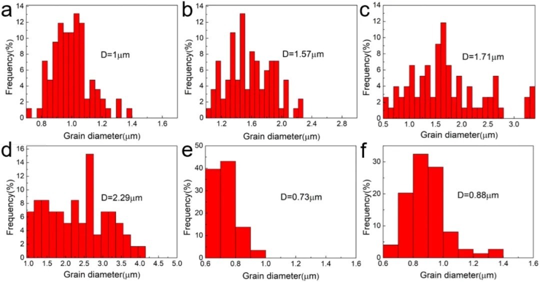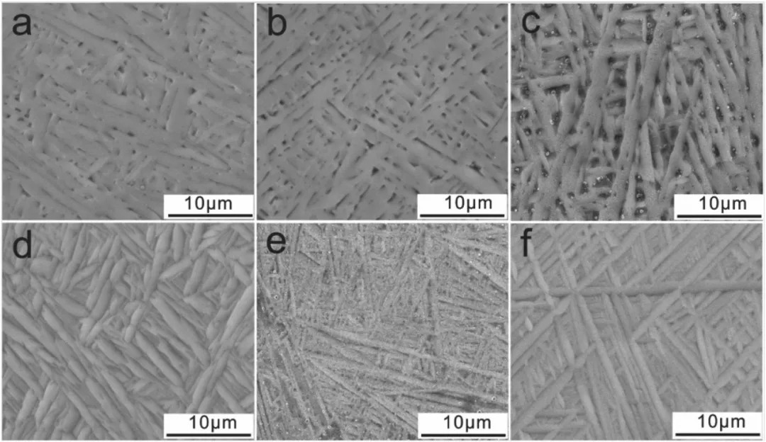 进一步对层状α相的EBSD观察如图7所示,表明这些样品主要由不同宽度的层状α结构组成,如图8所示。在EPT-0、EPT-6、EPT-7和EPT-7.5样品中,随着放电电压的增加,α片层宽度从1.0μm增加到2.29μm(图7a-d)。值得注意的是,当电场放电电压分别达到8 kV和8.5 kV时,α片层结构明显细化为0.73 μ m和0.88 μ m(图8e和f)。