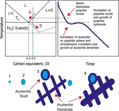 描述球墨铸铁凝固过程的相图、冷却曲线和步骤。