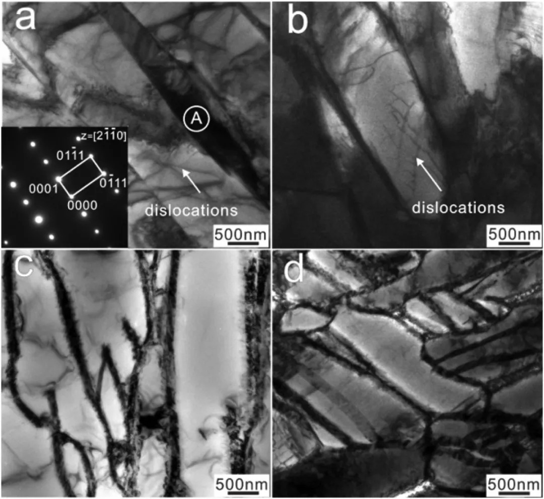 为了验证位错结构在样品中的演化进行了TEM实验。图9a为样品EPT-0的微观结构,以“A”标记的区域的插入选区电子衍射(SAED)图形表示α相的HCP结构。在EPT-0(图9a)和EPT-6(图9b)样品中,层状α相内部分别存在可见的位错,如图箭头所示。相比之下,EPT-7.5样品的位错密度明显降低。当电场电压达到8.5 kV时,出现了宽度为~300 nm的α超细片层结构(图9d)。